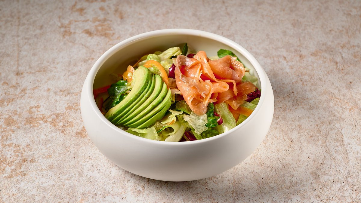 Με μιξ μαρουλιών, ντοματίνια, αγγούρια, καρότο, αβοκάντο, σολωμό καπνιστό και dressing πορτοκάλι