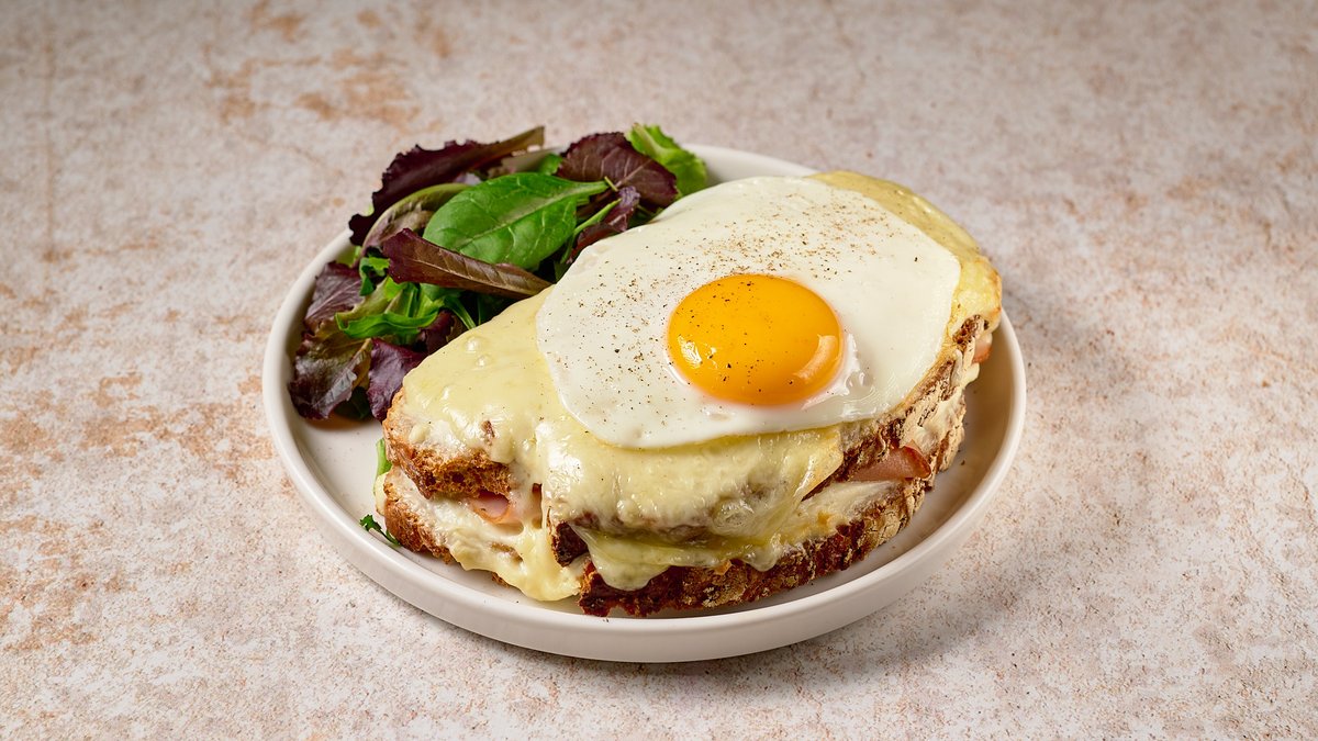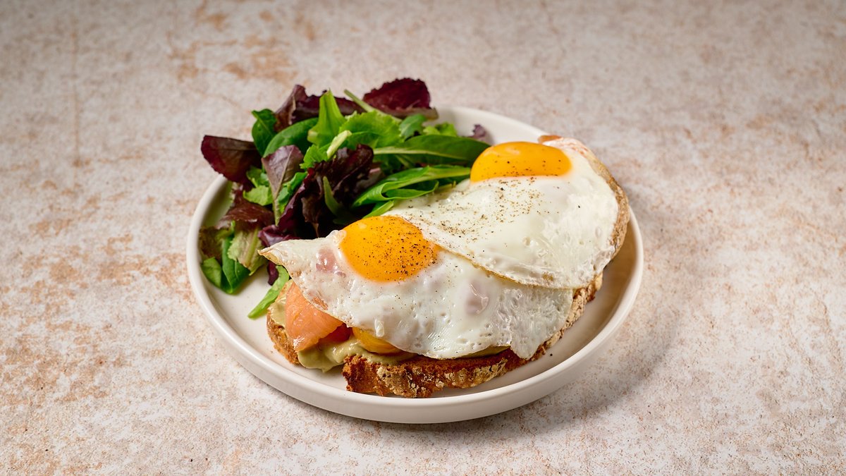 Με φέτες καρβέλι ολικής, μπεσαμέλ μουστάρδα, καπνιστή μπριζόλα και ένα αυγό