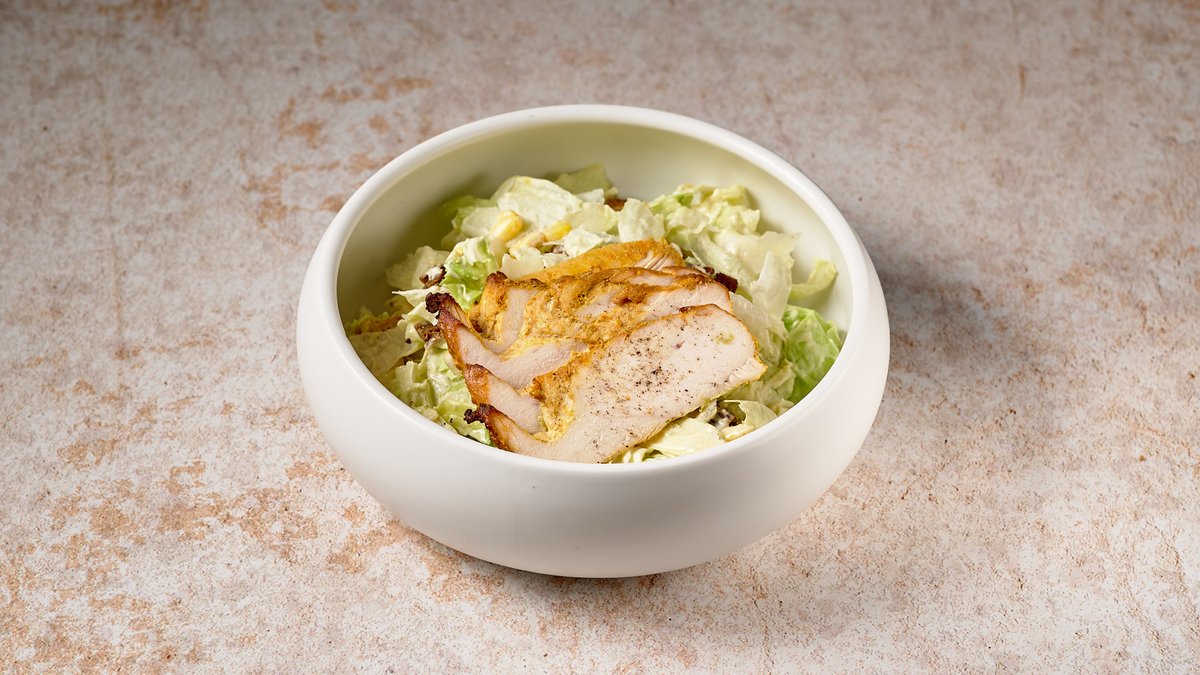 Με iceberg, καλαμπόκι, ντοματίνι, κοτόπουλο, κρουτόν και flakes παρμεζάνας και caesar sauce