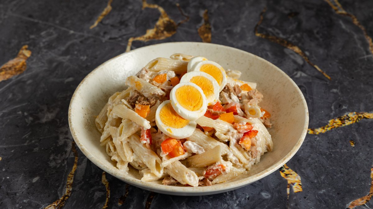 Με τόνο,πένες,πιπεριά ,αυγό βραστό και μαγιονέζα