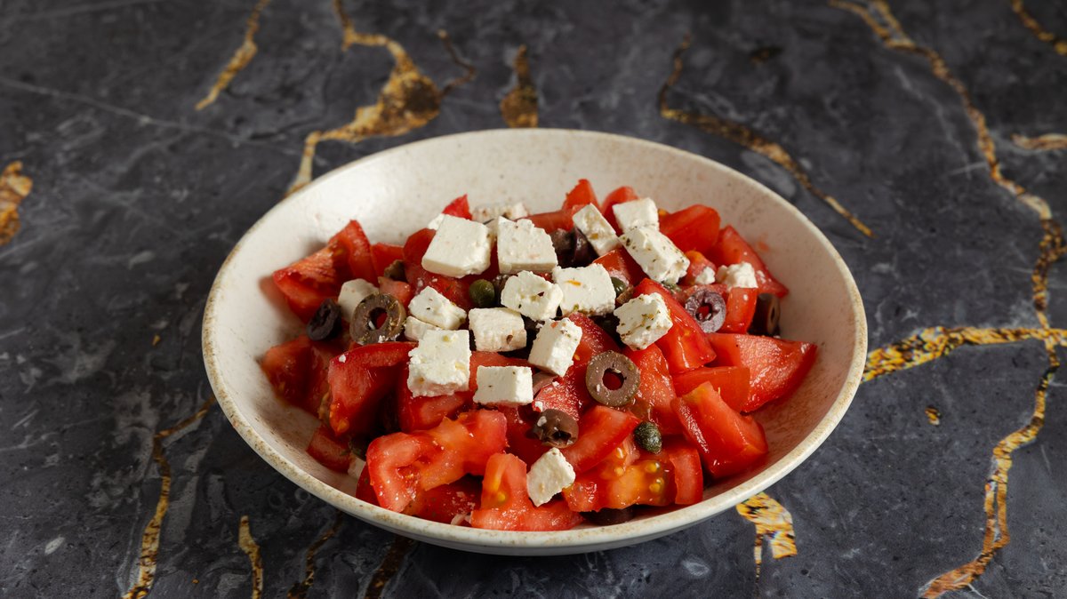 Με ντομάτα,ελιά ,φέτα , πιπεριά , συνοδεύεται από καρβέλι σίτου