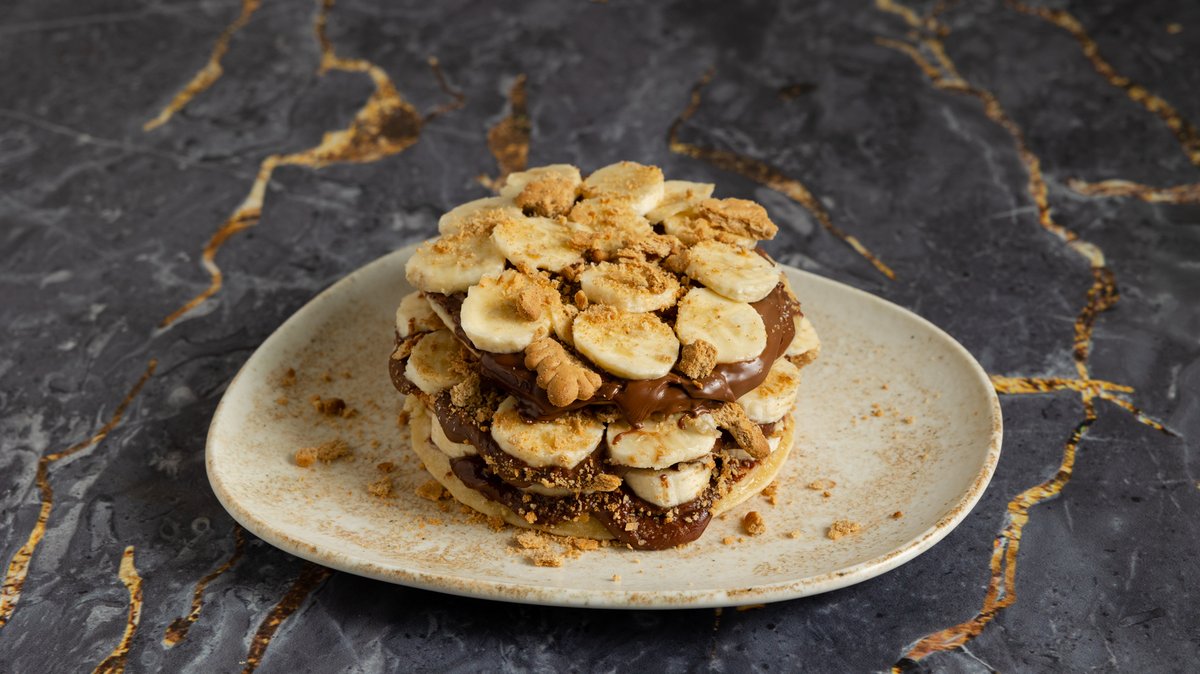 Pancakes με Πραλίνα Σοκολάτας, Μπανάνα , Μπισκότο