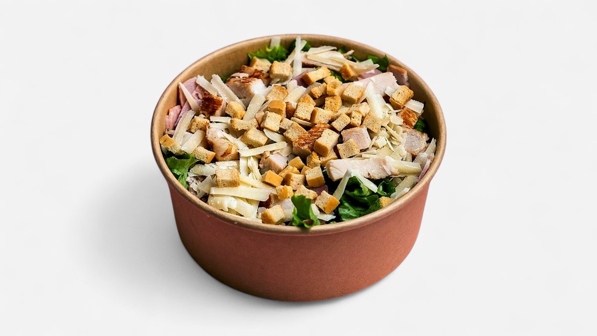 Με πράσινη σαλάτα,μπέικον, κοτόπουλο ,flakes παρμεζάνας, σος σίζαρς