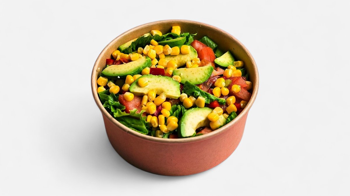 Με avocado,πράσινη σαλάτα,πιπεριά ,καλαμπόκι, ντοματίνια και dressing βαλσάμικο