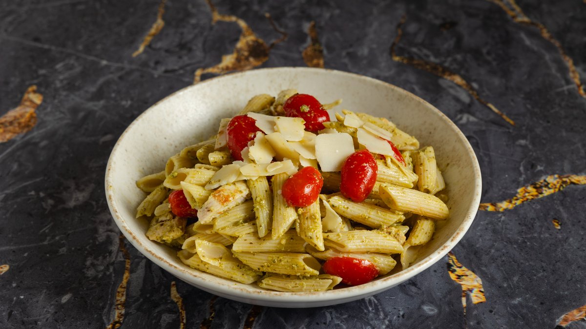 Με πένες ,pesto,φιλέτο κοτόπουλο, flakes παρμεζάνας , ντοματίνια