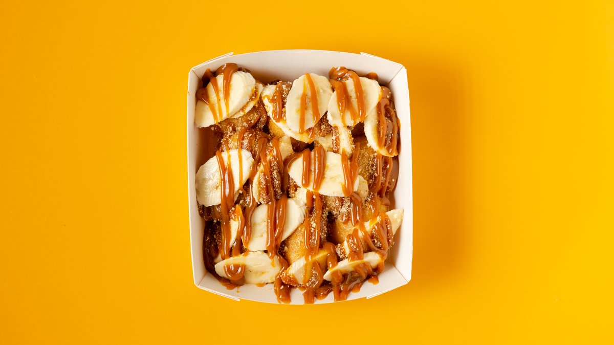 Banana caramel. Με πραλίνα αλμυρής καραμέλας, μπανάνα και τριμμένο μπισκότο