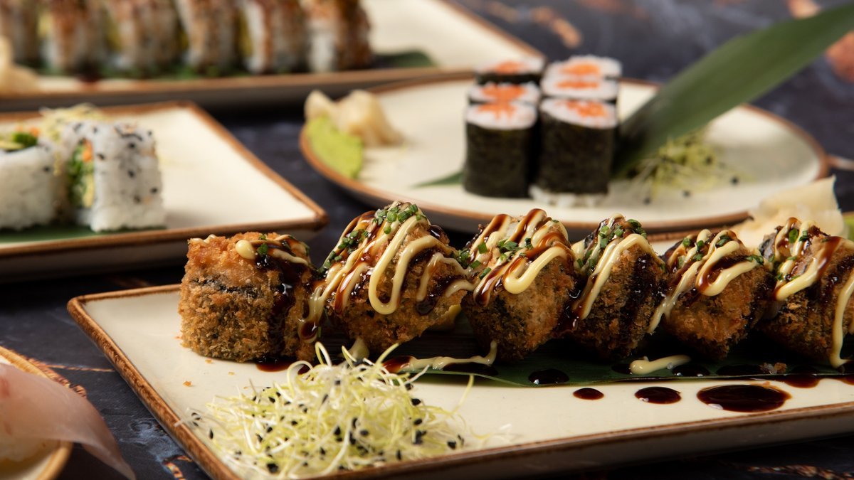 8 Τεμάχια. Λεπτοκομμένο φιλέτο ψαριού, θαλασσινού ή λαχανικού τυλιγμένο με ρύζι και φύκι
