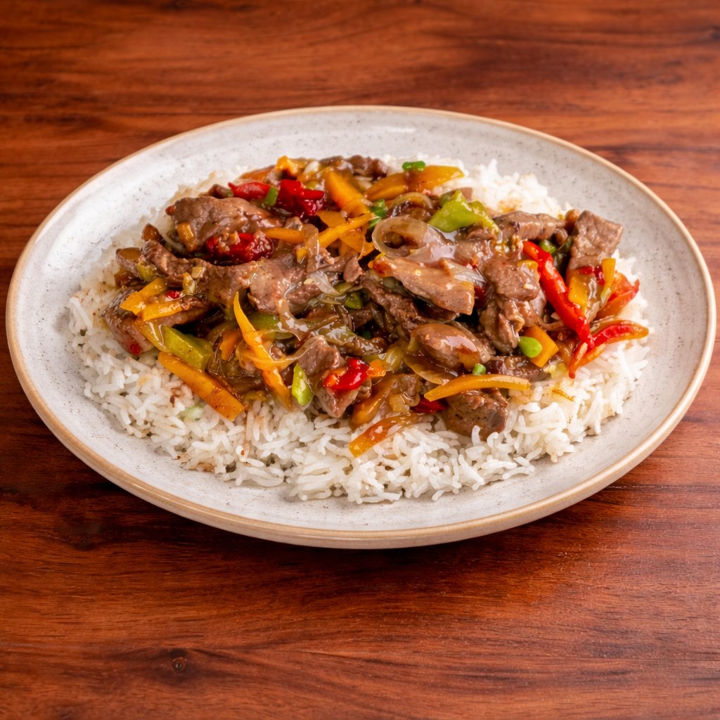 Μαριναρισμένες λωρίδες από μοσχάρι σε σάλτσα κρασιού και σόγιας με ψιλοκομμένα λαχανικά