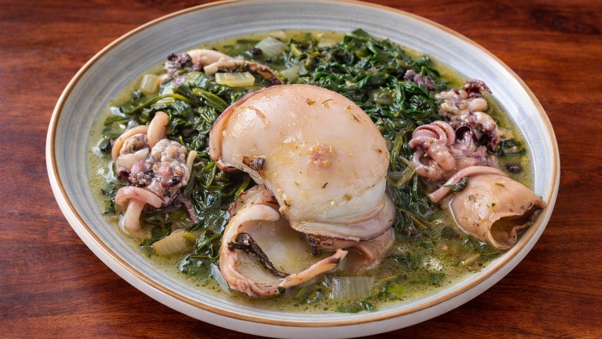Φρέσκιες σουπιές μαγειρεμένες με φρέσκο σπανάκι ,μυρωδικά και σως λεμονιού