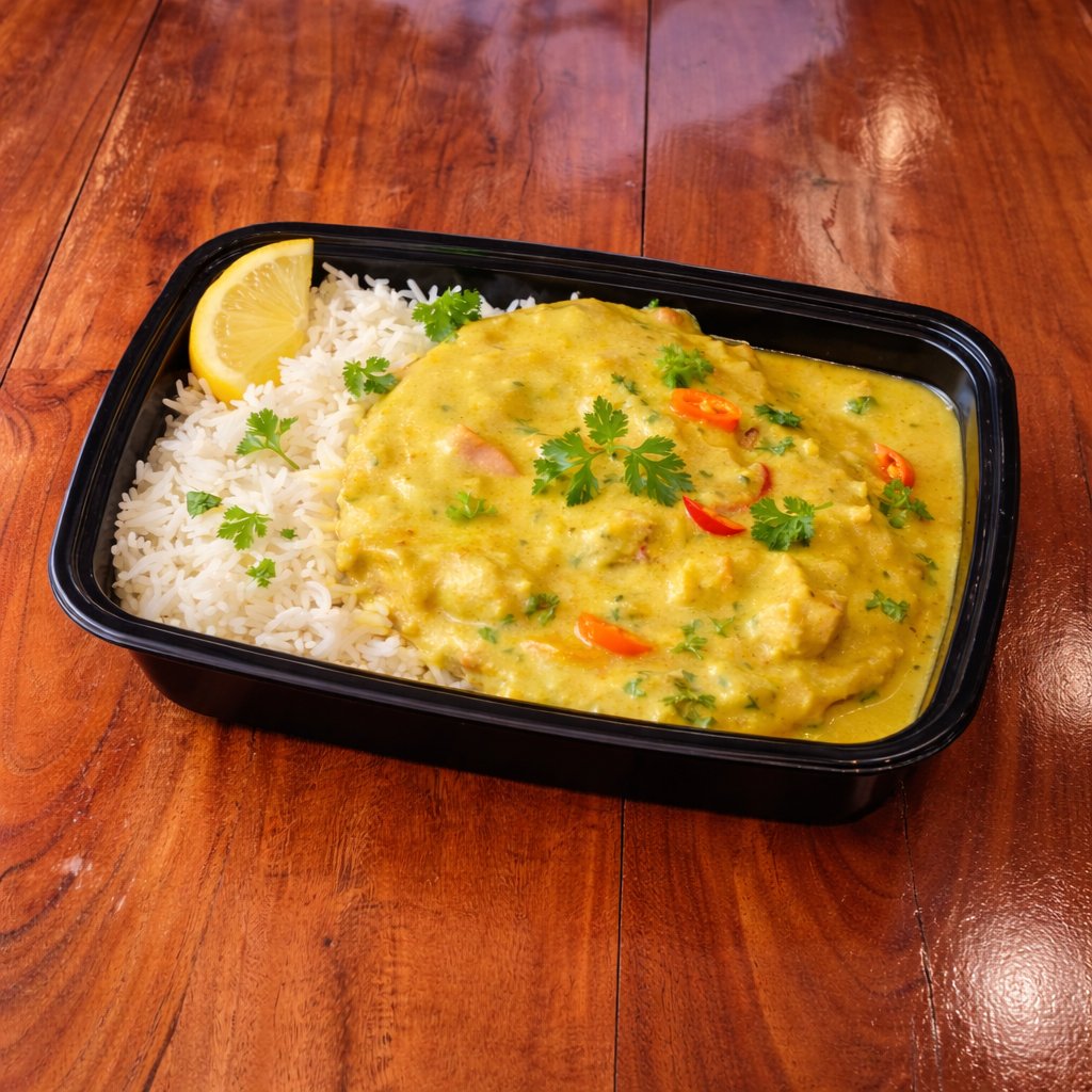 Κοτόπουλο με γάλα καρύδας, κάρι και ξύσμα λεμονιού. Συνοδεύεται από γαρνιτούρα επιλογής
