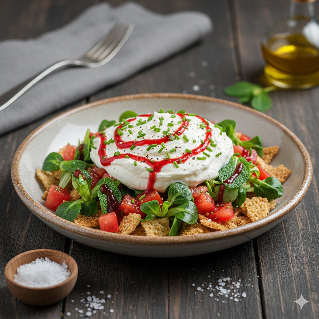 Με τρίμμα κριθαρένιο παξιμάδι, οξύμελο, κρέμα φέτας, σχοινόπρασο, δυόσμο, ψιλοκομμένη τομάτα και βαλεριάνα