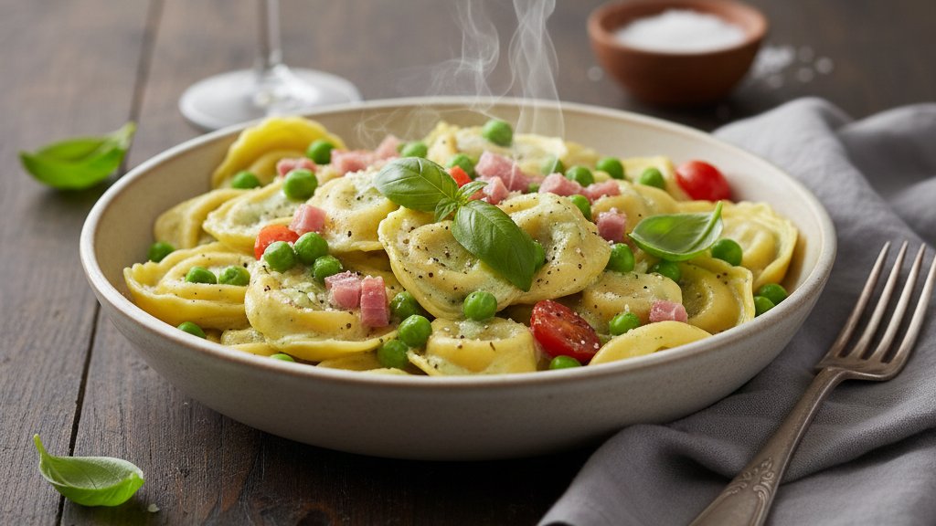 Τορτελίνια με σάλτσα κρέμα αρακά χοιρινή ωμοπλάτη ντομάτα και βασιλικό