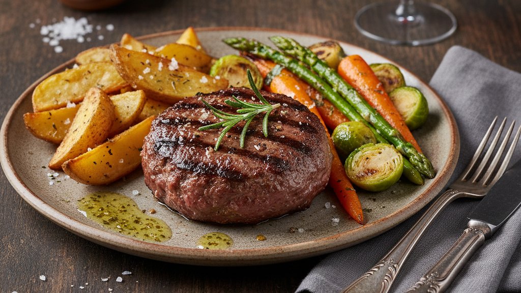 Μπιφτέκι Σχάρας με Πατάτες και Λαχανικά Ψητά