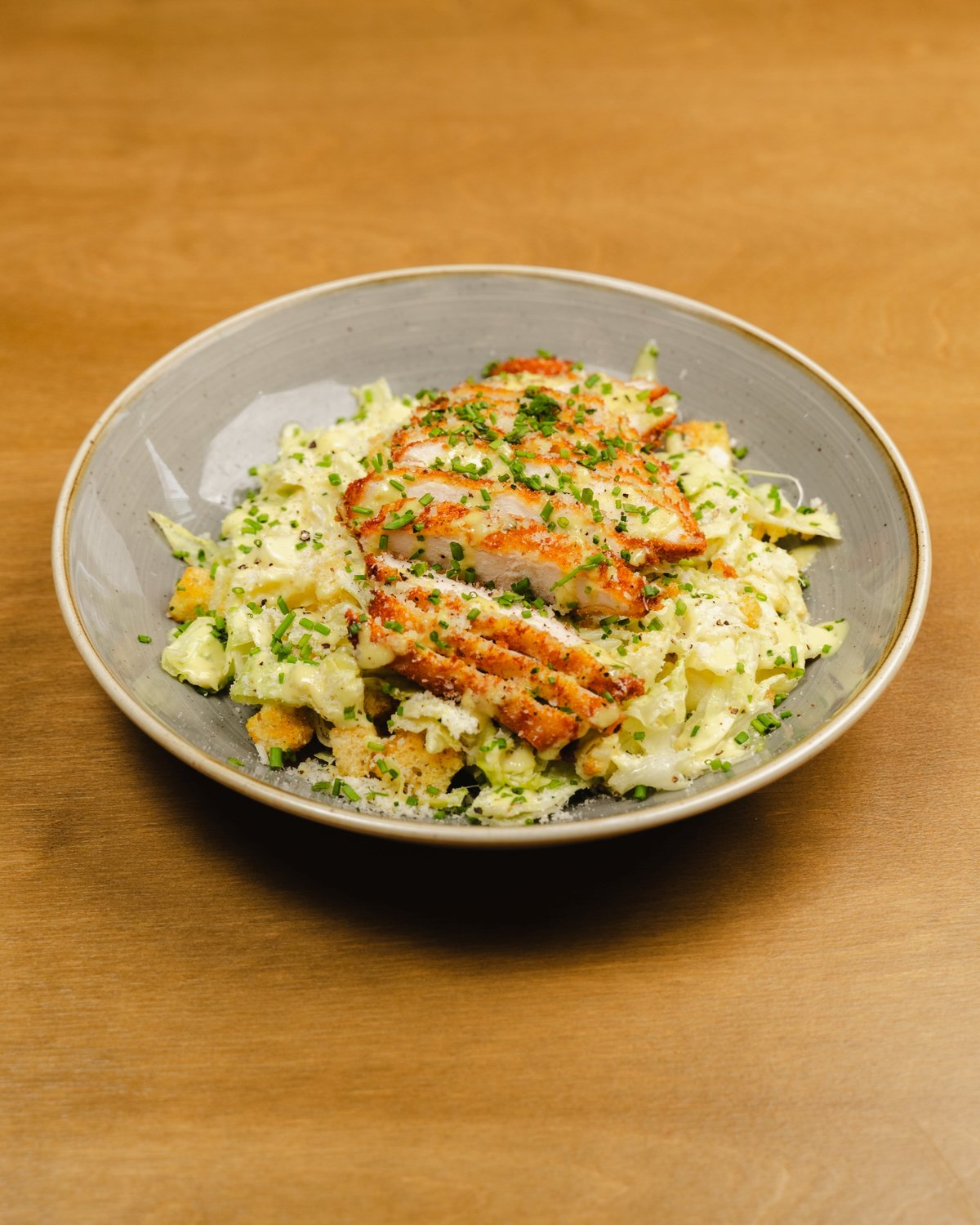Με φιλέτο κοτόπουλο παναρισμένο με panko bacon, αρωματικά κρουτόν, παρμεζάνα, iceberg και caesar's sauce