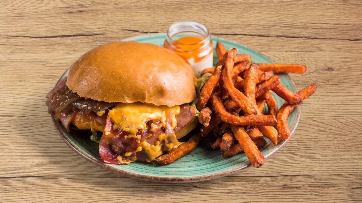 2 Μπιφτέκια smushed από 100% μοσχαρίσιο κιμά, gouda, iceberg, ντομάτα,τηγανητό κρεμμύδι και bbq sauce.