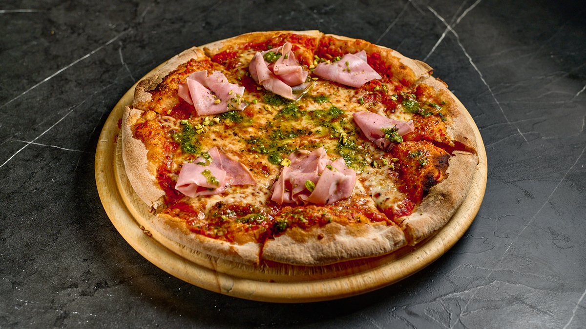 Με σάλτσα ντομάτας, san marzano, μοτσαρέλα, πέστο φυστίκι και μορταδέλα