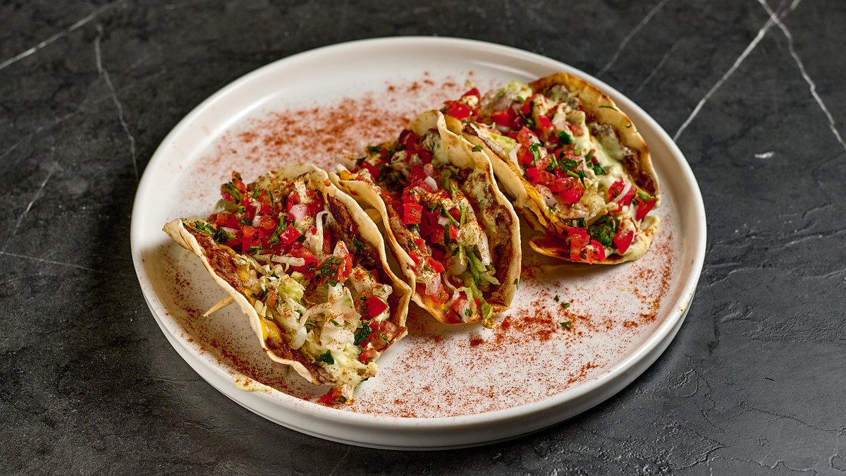 3 soft tortillas με παναρισμένες λωρίδες κοτόπουλο σε buttermilk, guacamole, pico de gallo και sour cream