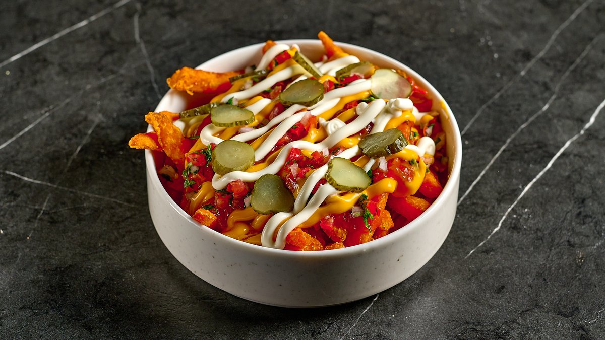 Γλυκοπατάτες με mexican sauce, cheddar sauce, mayo και pickles