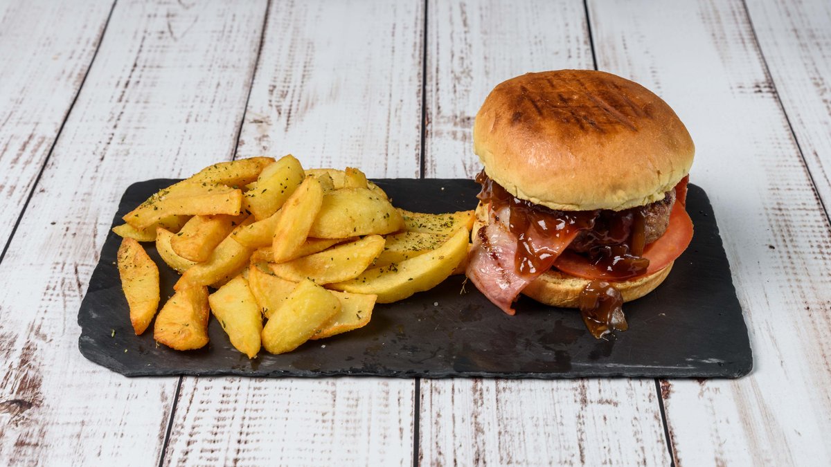 Ψωμάκι brioche με μπιφτέκι από 100% φρέσκο μοσχαρίσιο κιμά 200 g, μπέικον, cheddar, ντομάτα, καραμελωμένα κρεμμύδια, αυγό τηγανητό και BBQ sauce