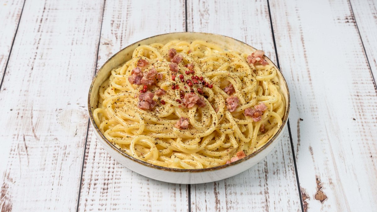 Bucatini με κρέμα, μπέικον και σπασμένα πιπέρια