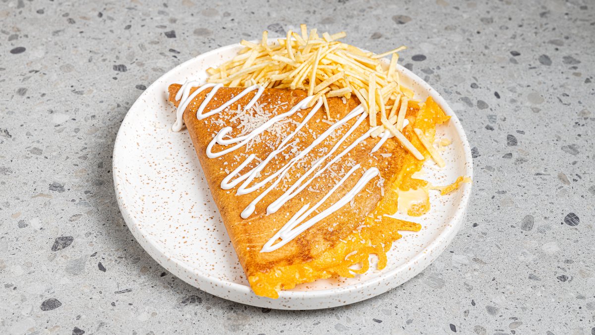 Kοτόπουλο φιλέτο, αβοκάντο sauce, ντομάτα, gouda, καλαμπόκι, cheddar sauce