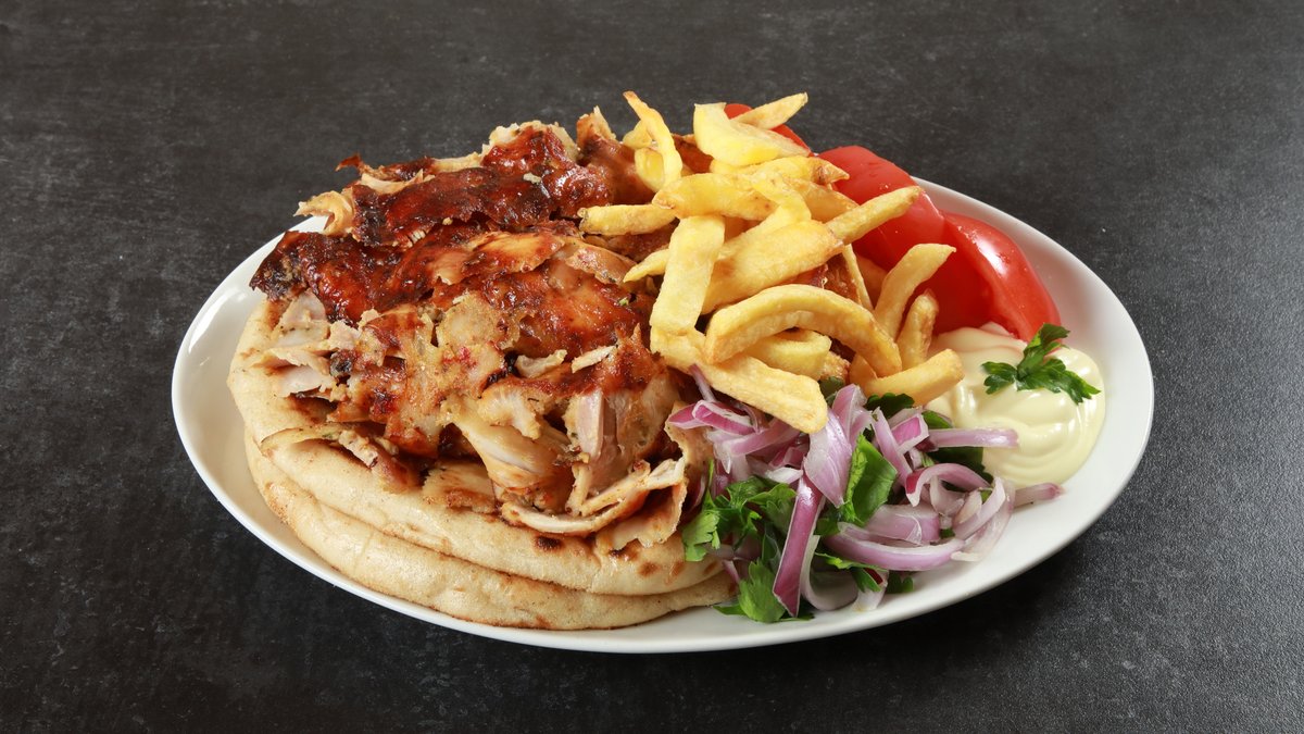 Σκεπαστή γύρος κοτόπουλο με τα υλικά της επιλογής σου. Συνοδεύεται από πατάτες τηγανητές