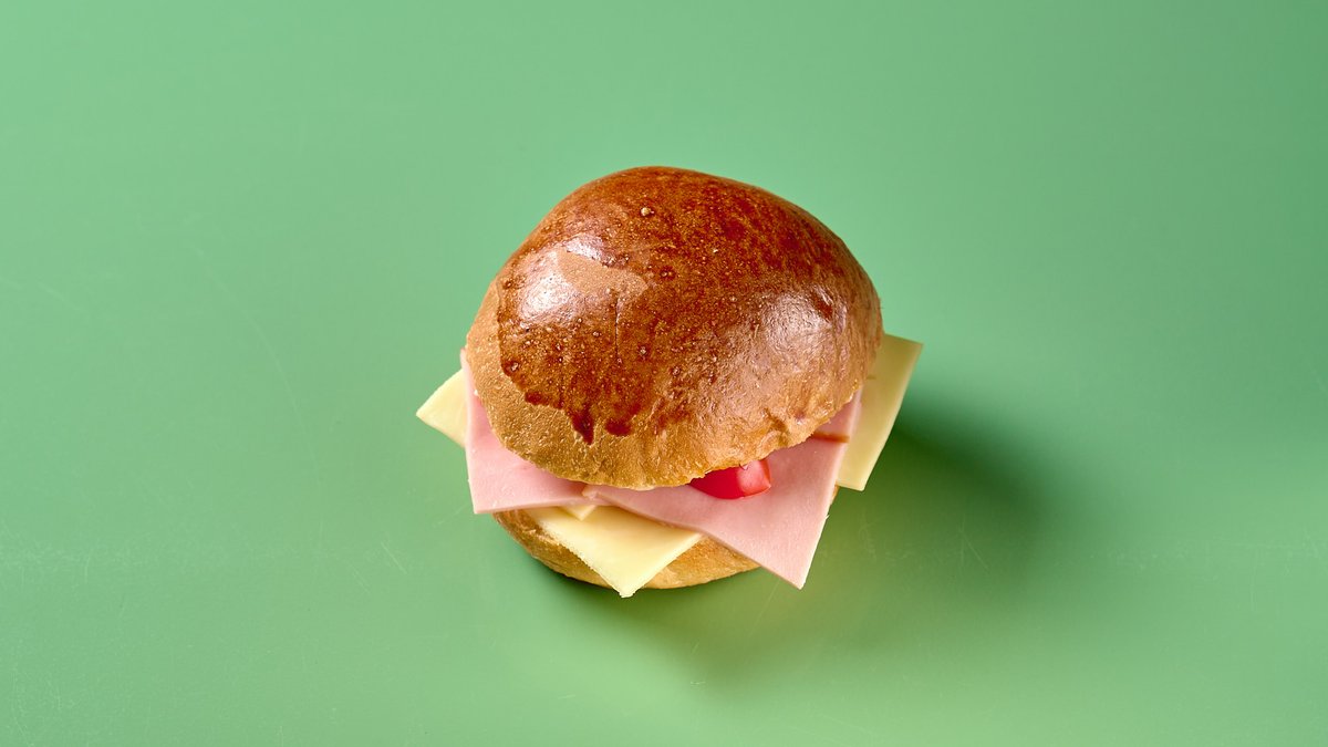 Brioche με γαλοπούλα καπνιστή, τυρί gouda, ντοματίνια και μαγιονέζα