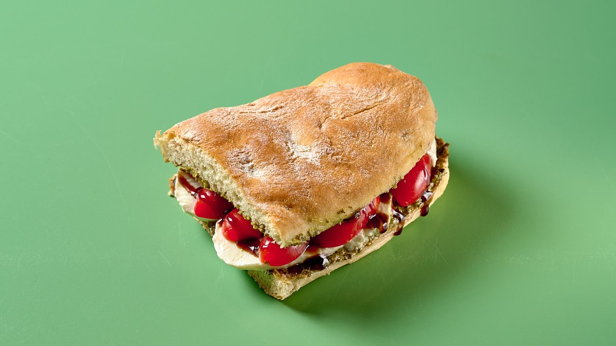 Ciabatta με μοτσαρέλα, ντοματίνια, πέστο και κρέμα βαλσάμικο