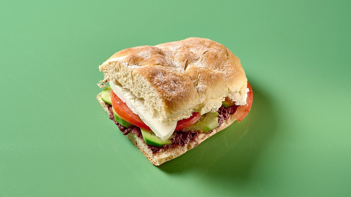 Ciabatta με ντομάτα, αγγούρι, τυρί μανούρι και πάστα ελιάς