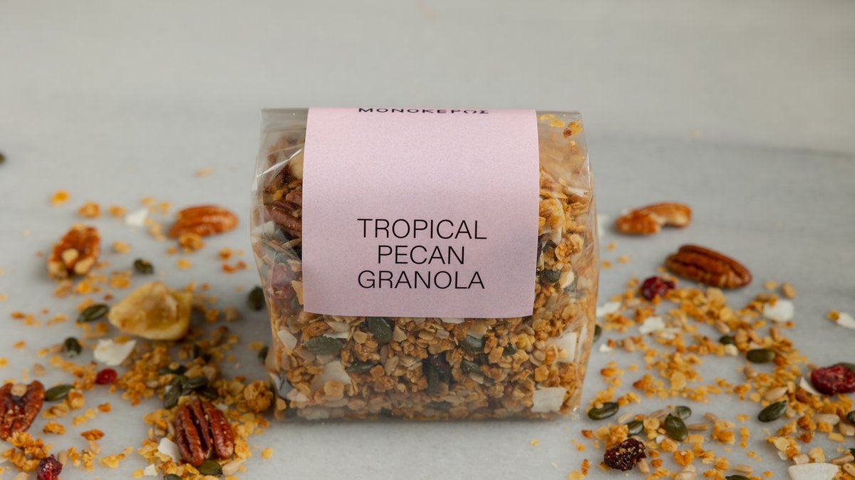 Απολαυστική χειροποίητη granola δικής μας παραγωγής με βρώμη, πεκάν, καρύδα, ηλιόσπορο, κολοκυθόσπορο, αποξηραμένα κράνα, τσιπς μπανάνας, μέλι, ελαιόλαδο.