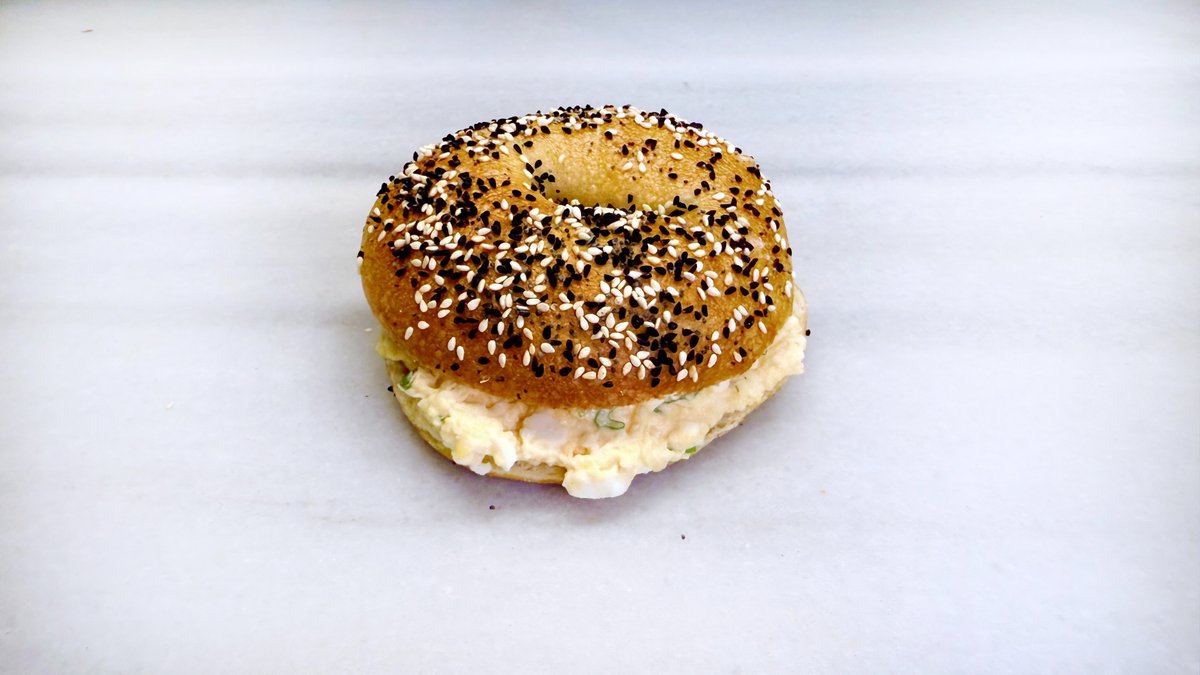 Monokeros bagel με αυγοσαλάτα: βραστό αυγό, μαγιονέζα, ψιλοκομμένο κρεμμύδι και φρέσκος μαϊντανός. Creamy, απλό και χορταστικό.