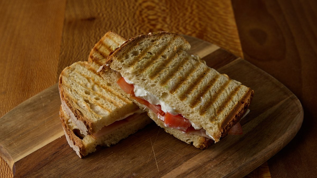 Ψωμί φρέσκο ζυμωτό με creamy gouda, γαλοπούλα καπνιστή Creta farm, Philadelphia και ντομάτα