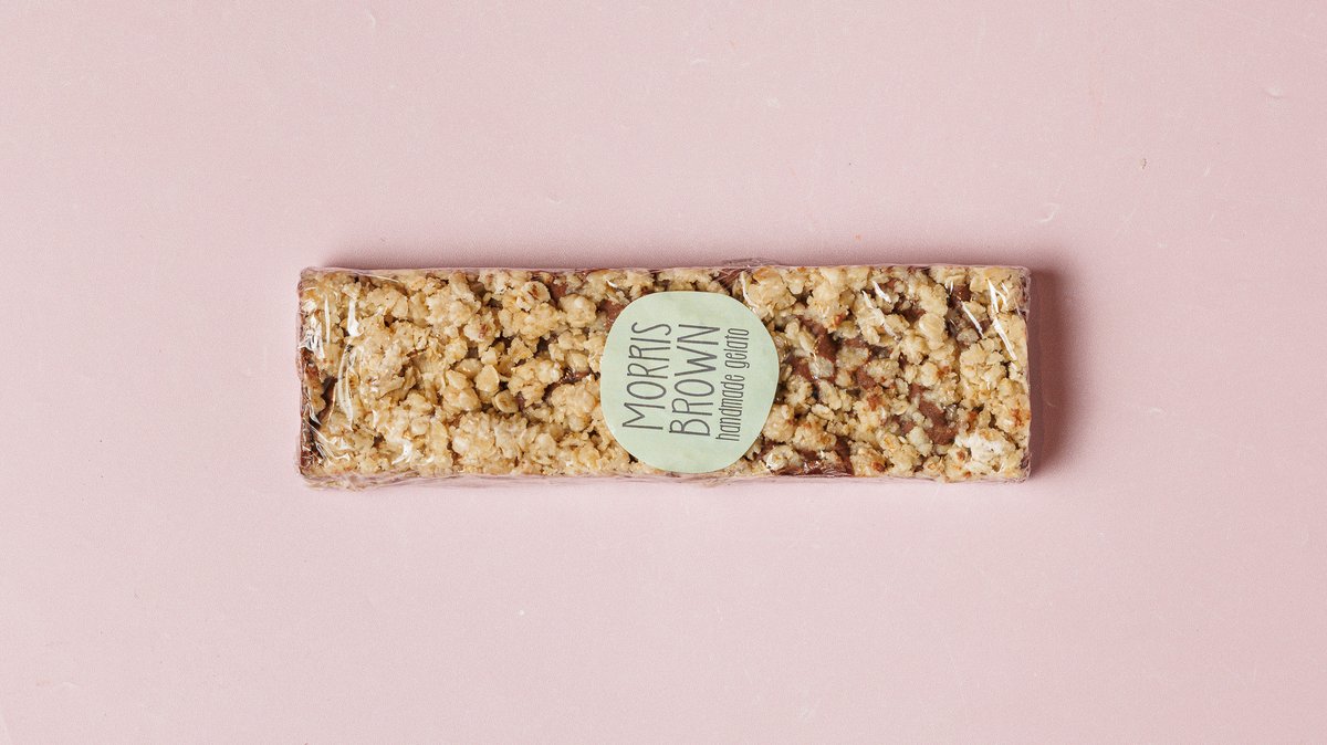 Με φυστίκια αιγίνης, βρώμη, λάδι καρύδας, κουβερτούρα σοκολάτας bitter και σιρόπι αγαύης