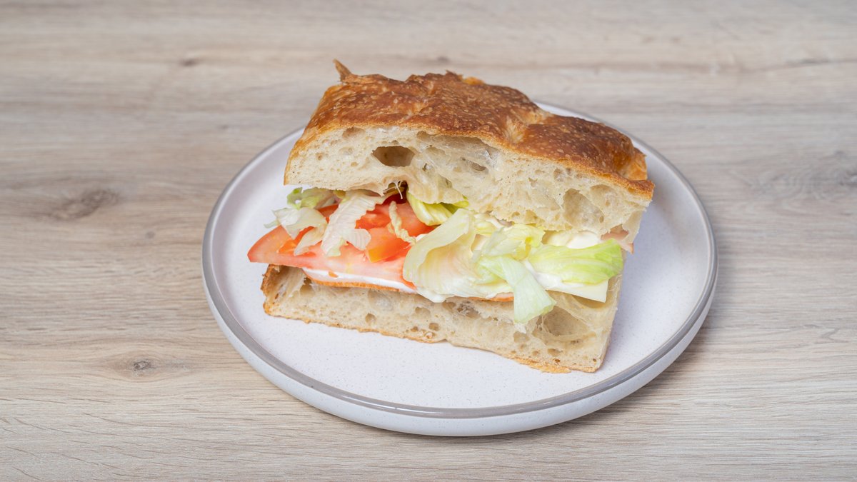 Focaccia με Γαλοπούλα Αφράτη focaccia γεμισμένη με καπνιστή γαλοπούλα, λιωμένο τυρί, ζουμερή ντομάτα, τραγανό iceberg και ελαφριά μαγιονέζα. Ισορροπημένο και χορταστικό, ιδανικό για κάθε στιγμή της ημέρας.
