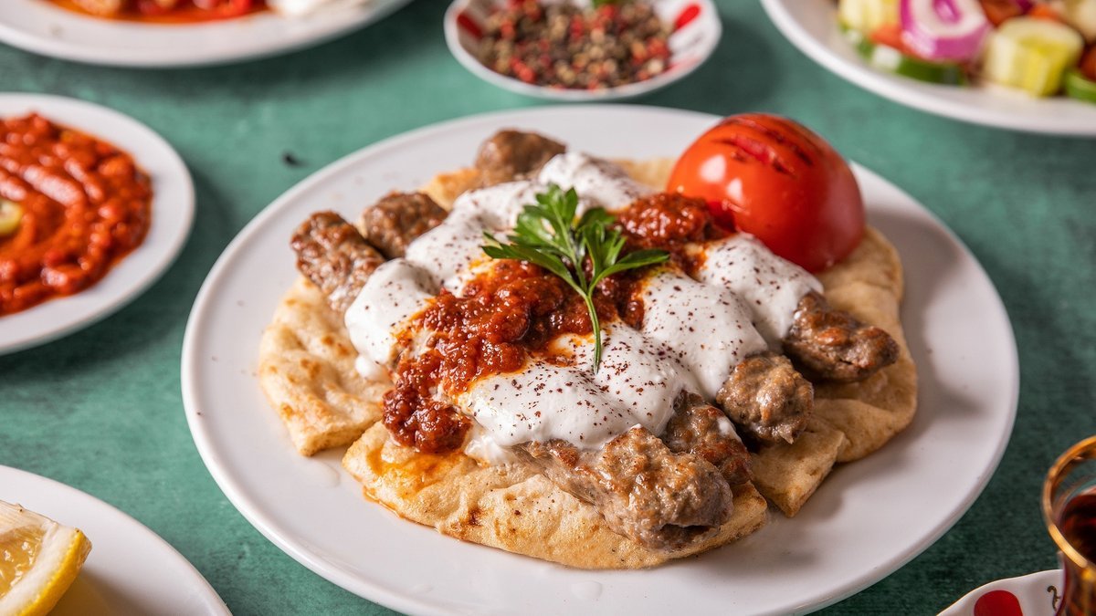 Μοσχαρίσια κεμπαπ με χλιαρό γιαούρτι σακούλας απο πάνω, ζεστή σάλτσα ντομάτας και σουμάκ (4 τεμάχια)