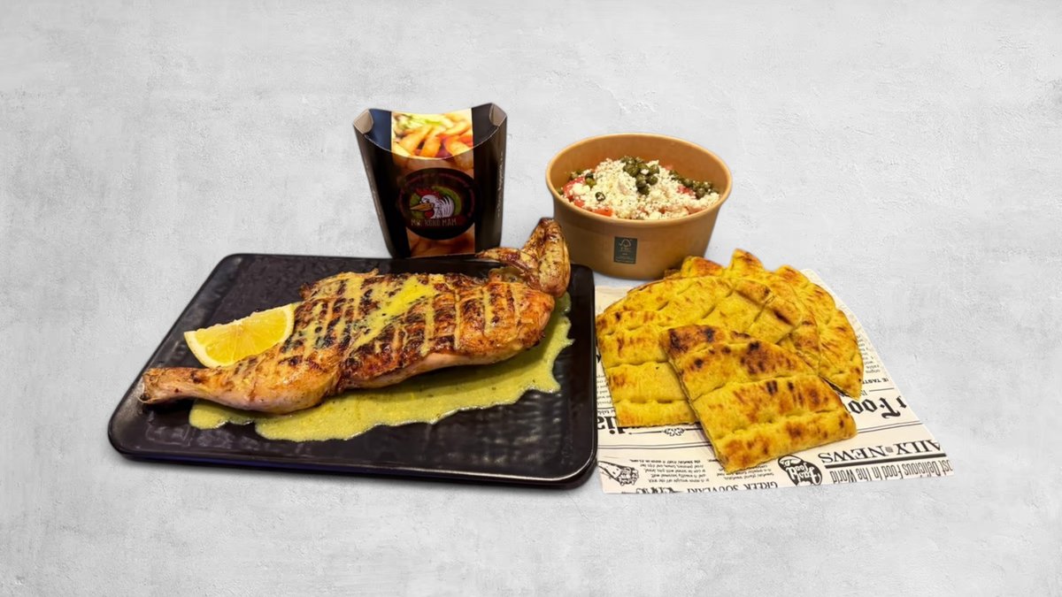 Κοτόπουλο Σχάρας Μισό + 1 Ατομική σαλάτα επιλογής + 1 Πατάτες + 2 Πίτα καλαμποκιού