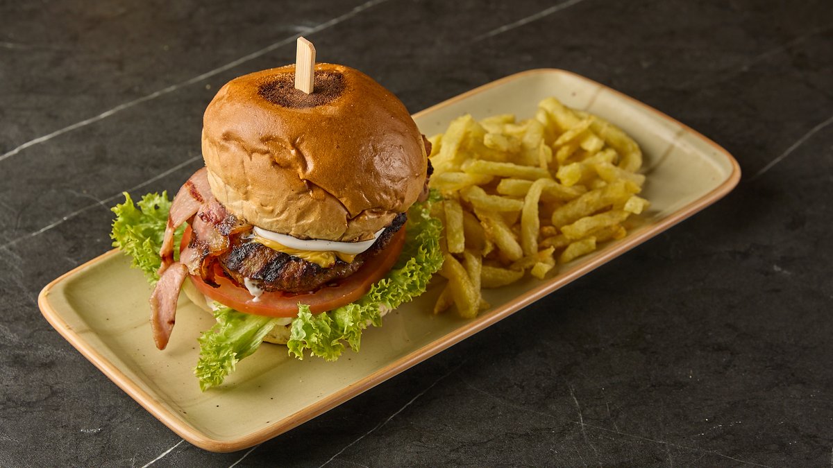 Με φρεσκοκομμένο μοσχαρίσιο κιμά, τραγανό μπέικον, ντομάτα, μαρούλι, τυρί cheddar, κρεμμύδι, μαγιονέζα