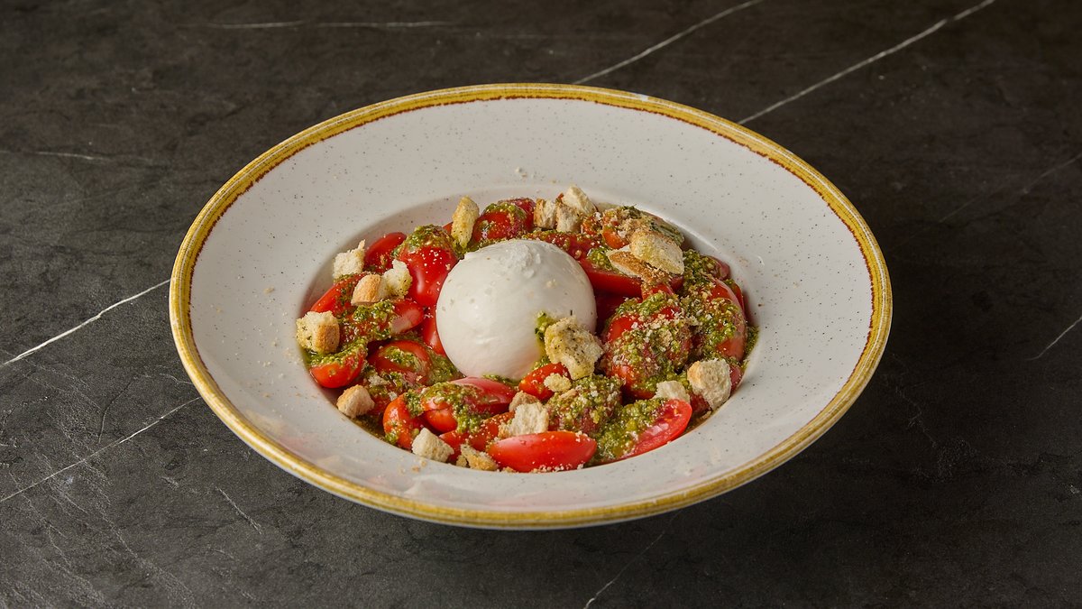 Ζουμερά ντοματίνια με buratta, pesto, φρέσκο ελαιόλαδο