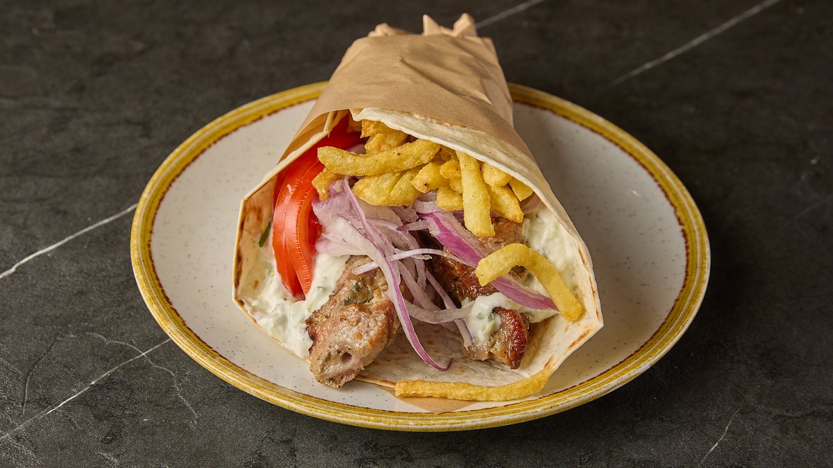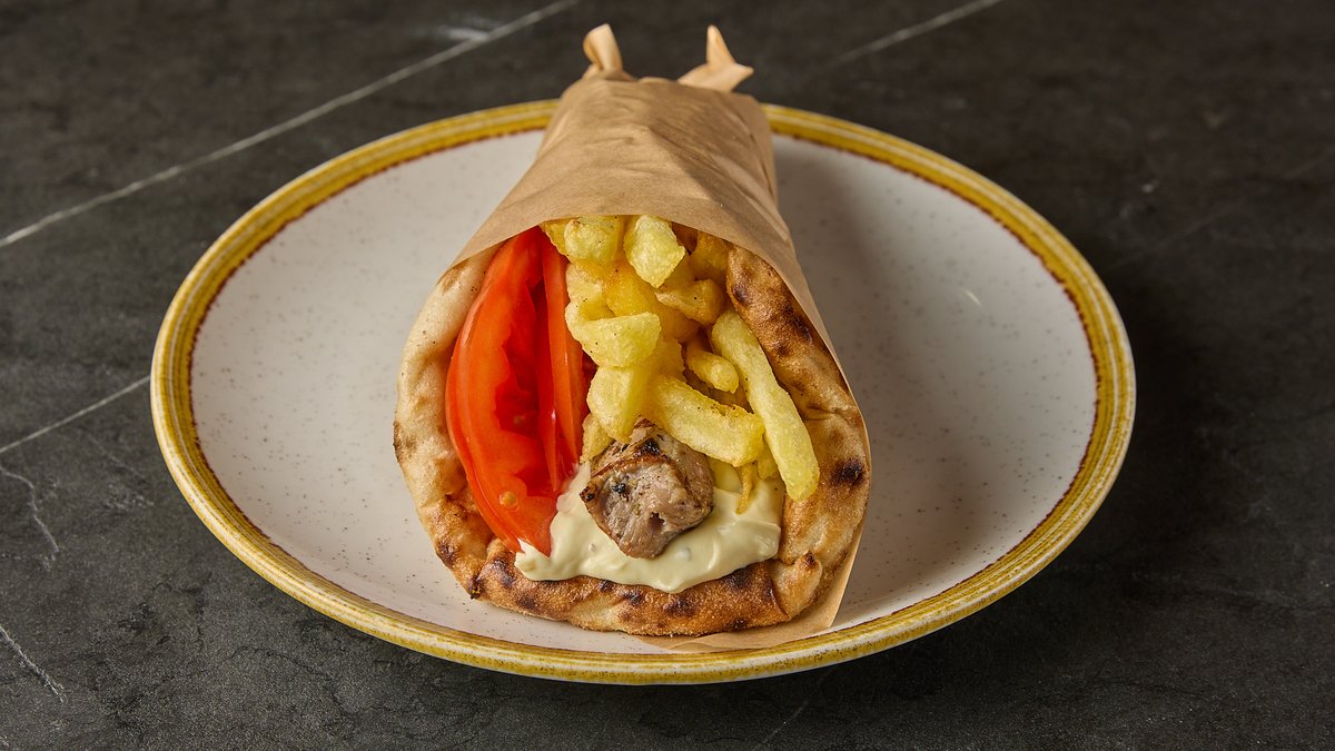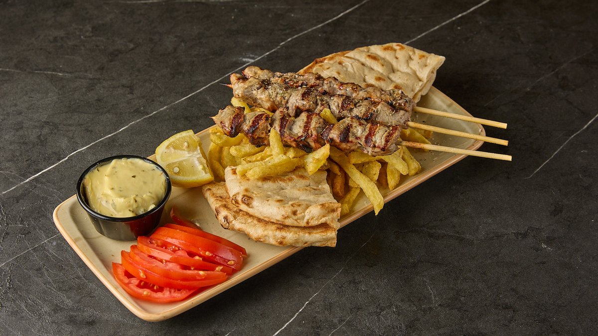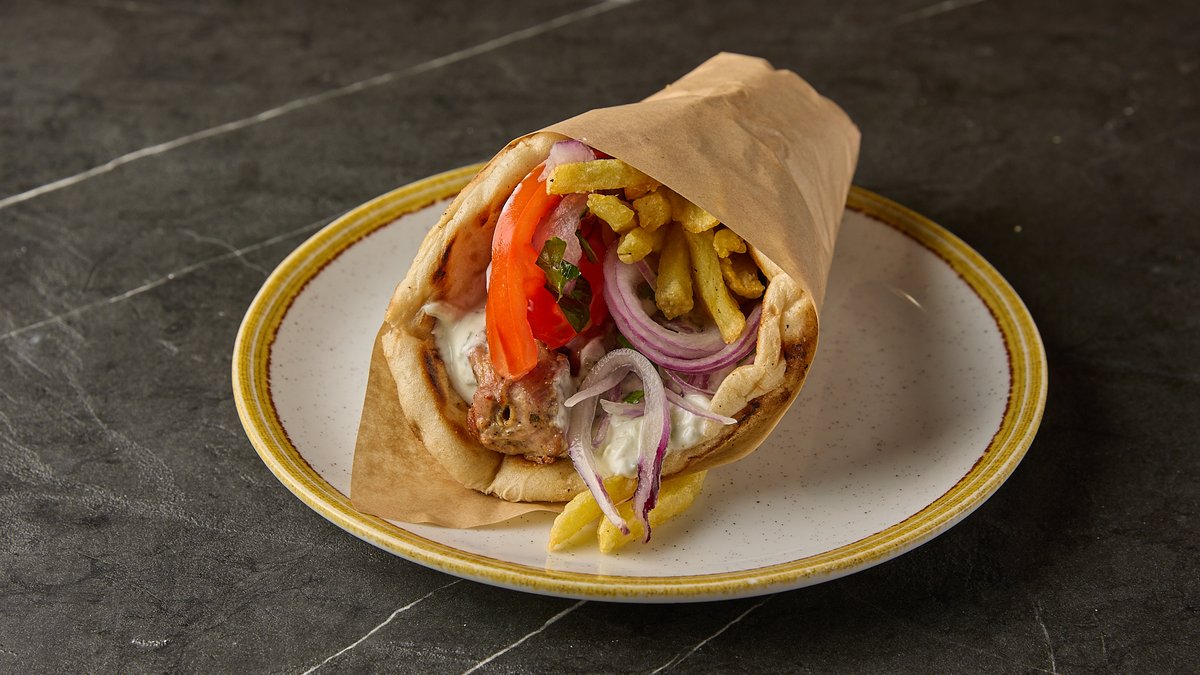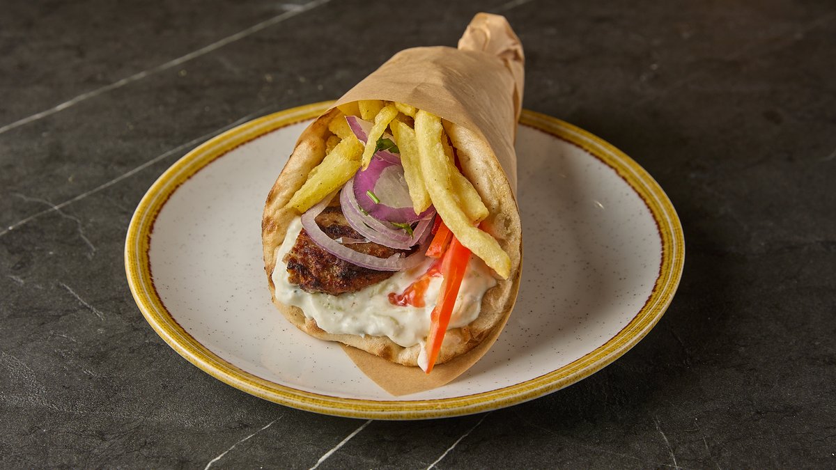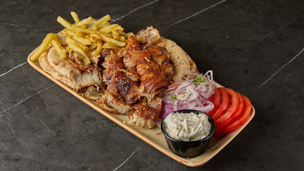 Συνοδεύεται από πίτα, ντομάτα, κρεμμύδι, τζατζίκι και πατάτες τηγανητές