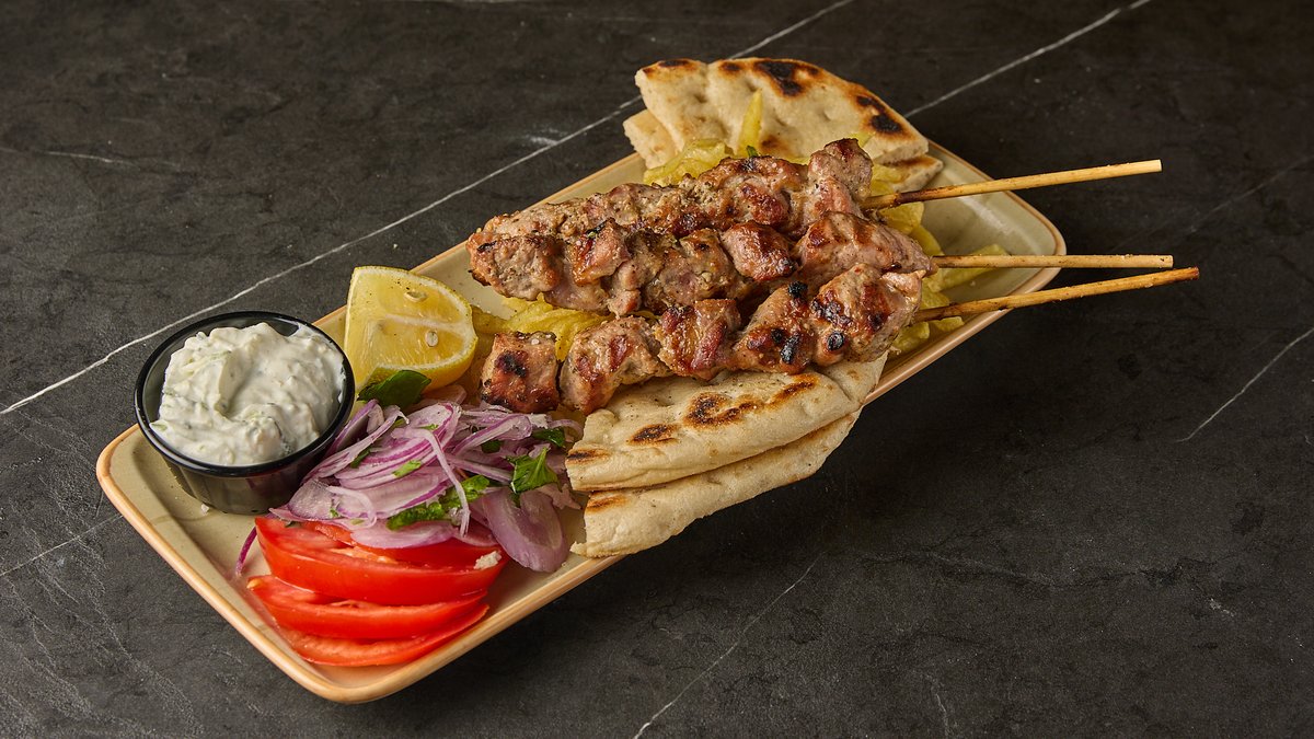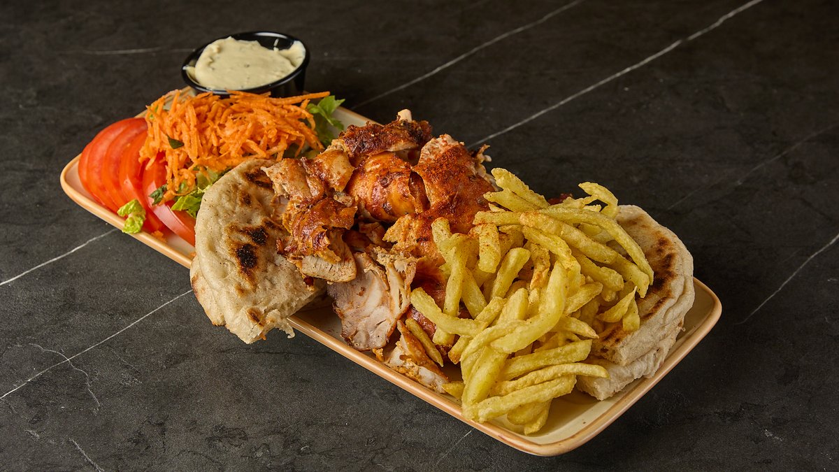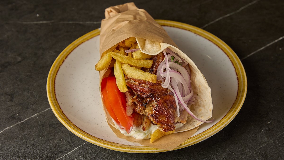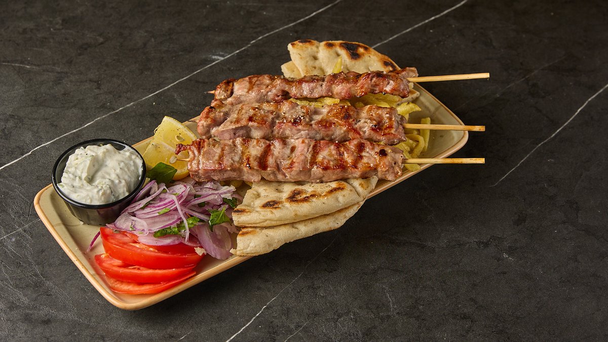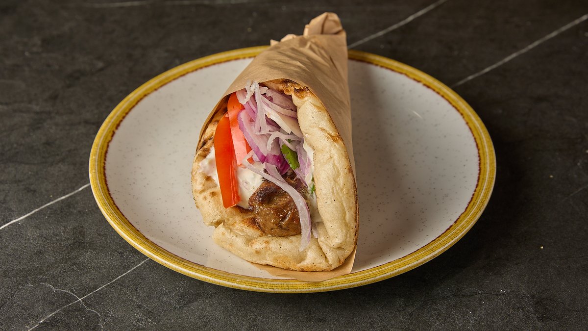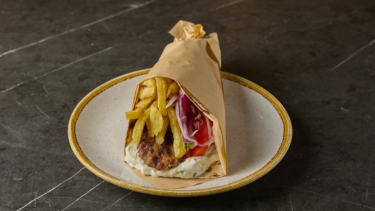 Συνοδεύεται από πίτα, ντομάτα, κρεμμύδι, τζατζίκι και πατάτες τηγανητές