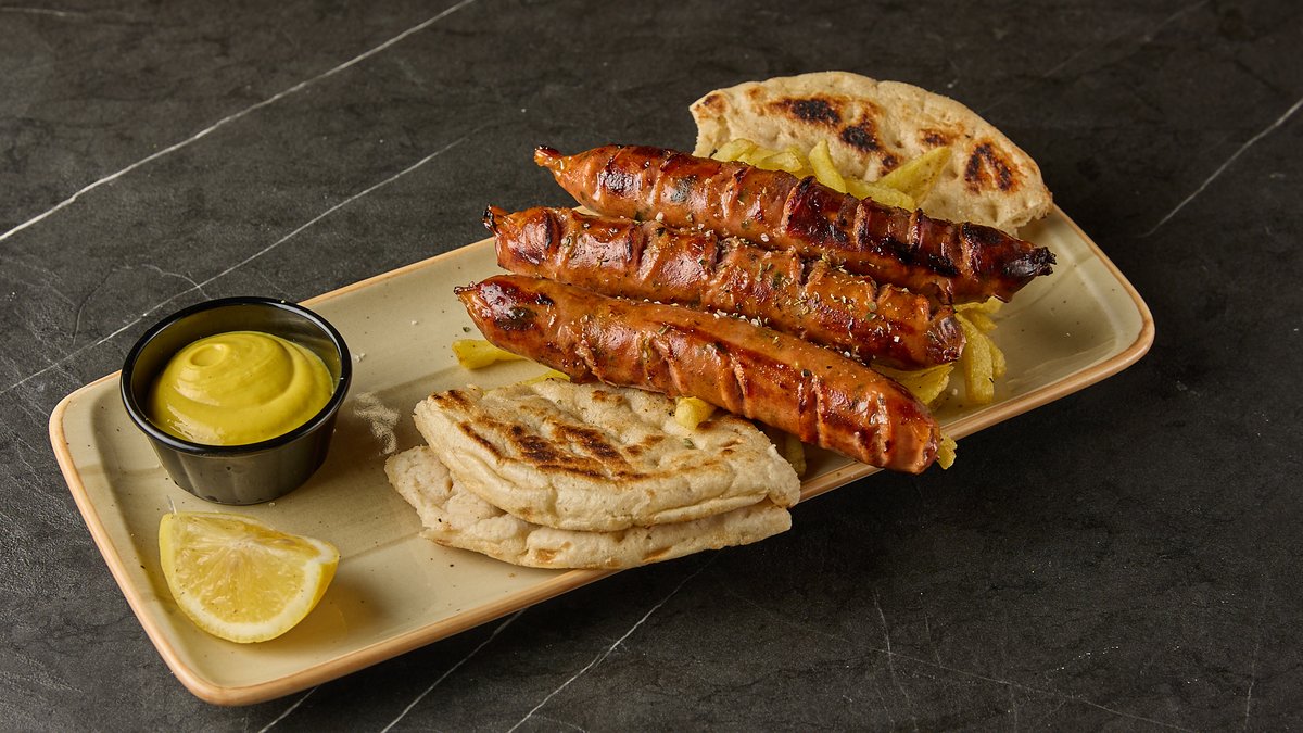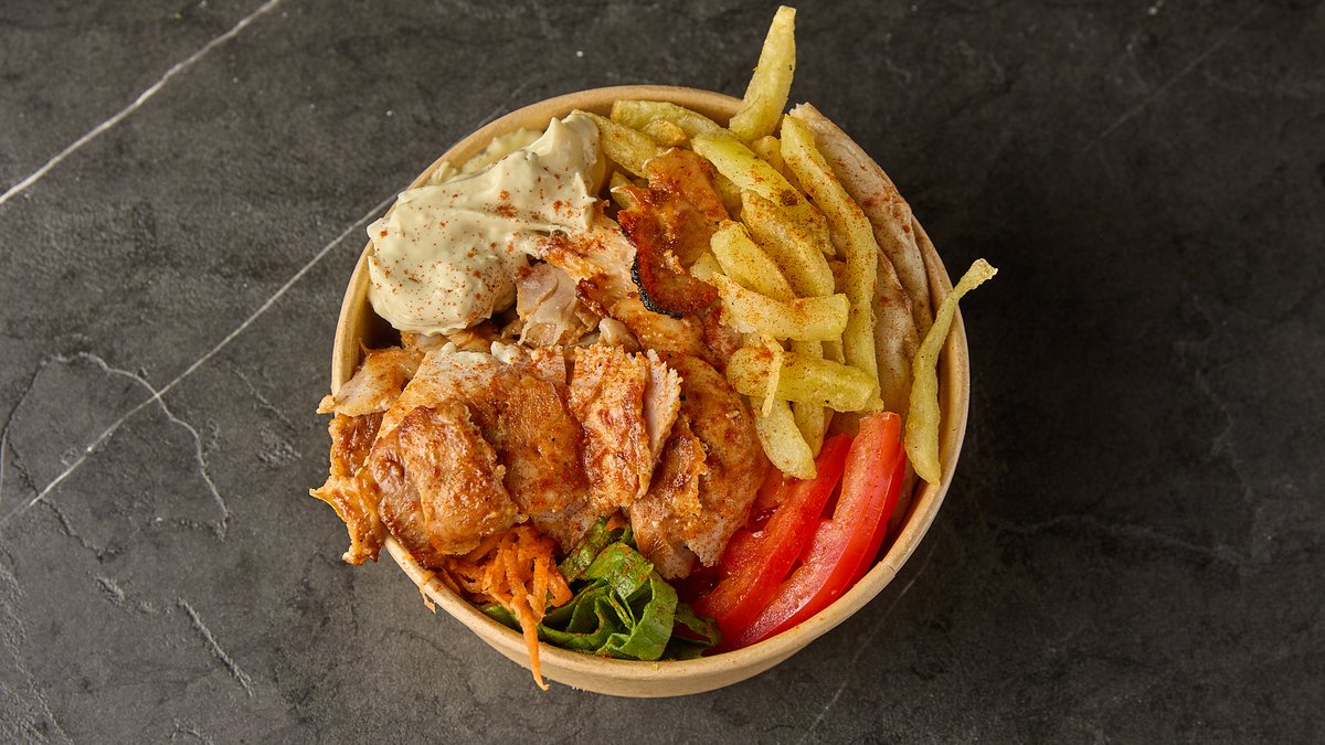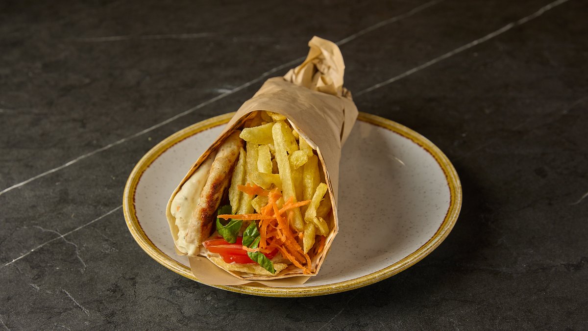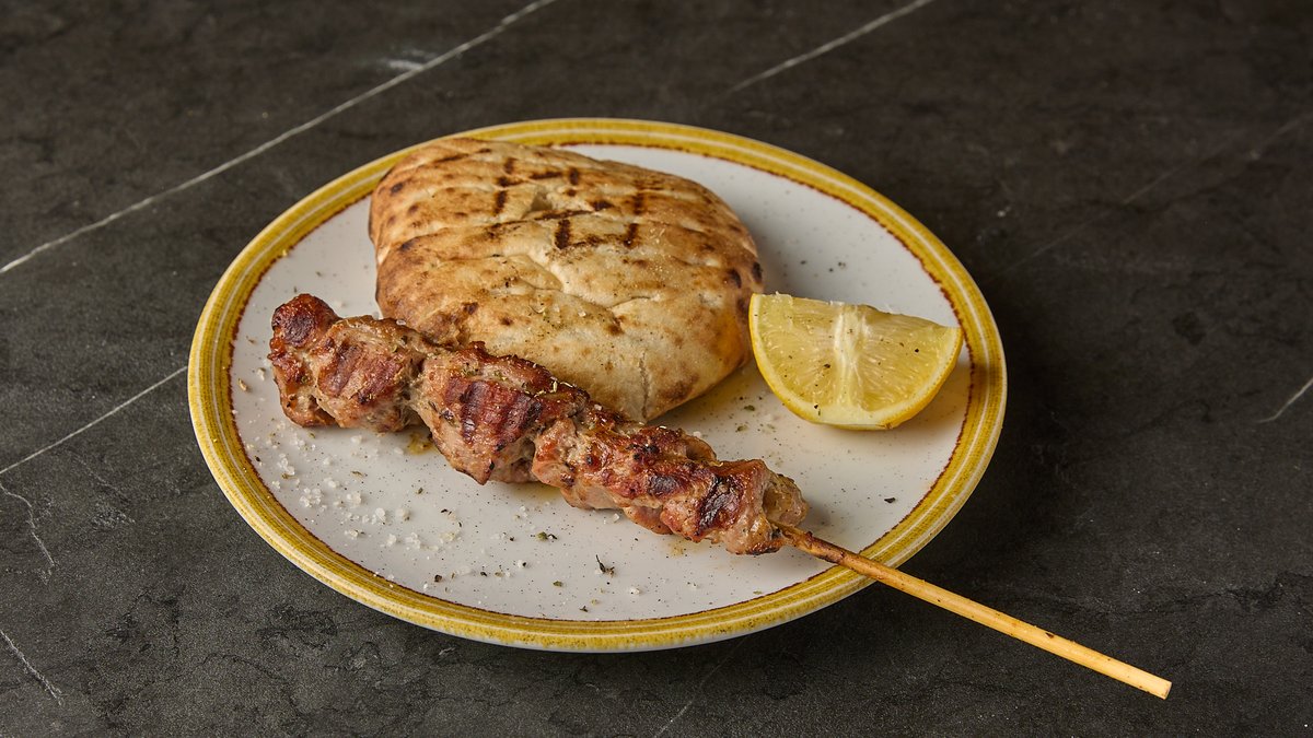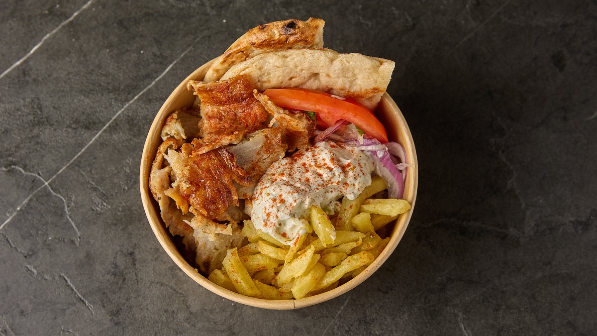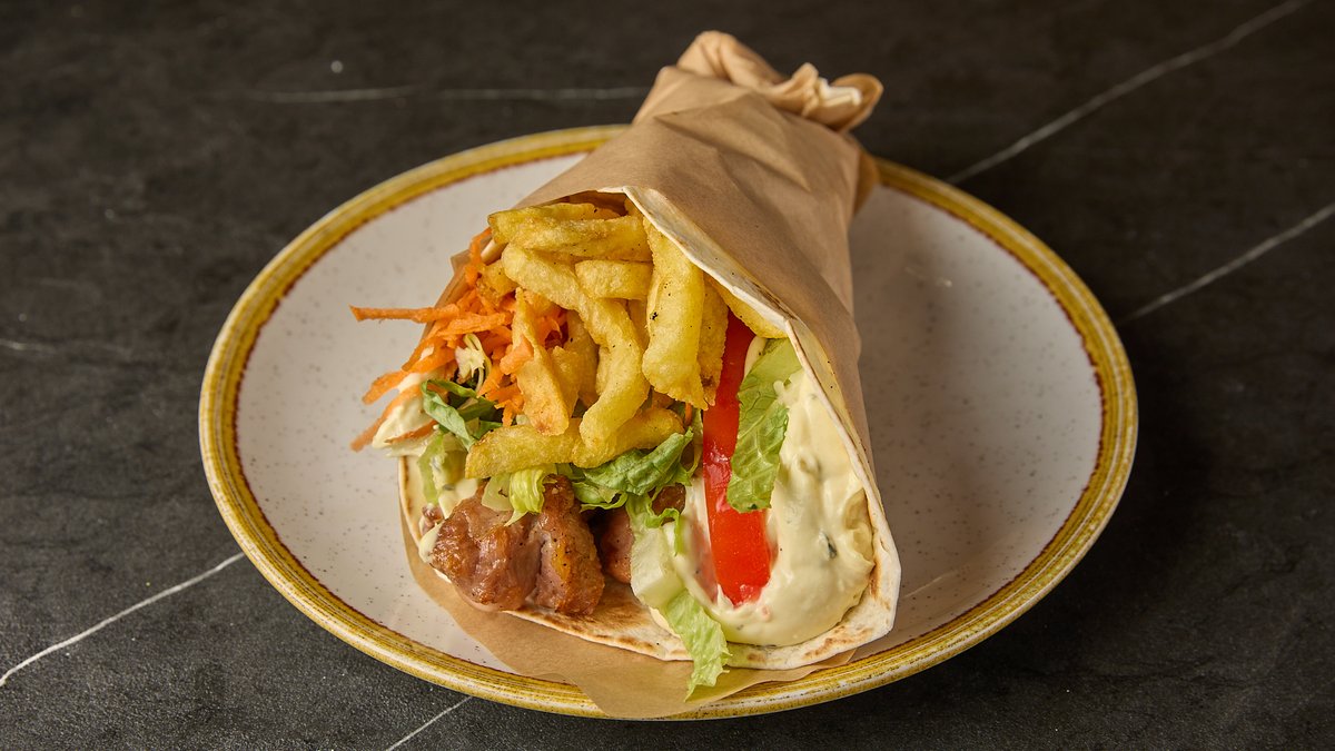 Συνοδεύεται από πίτα, ντομάτα, κρεμμύδι, τζατζίκι και πατάτες τηγανητές