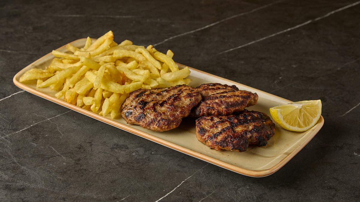 3 Τεμάχια. Συνοδεύεται από πίτα, ντομάτα, κρεμμύδι, τζατζίκι και πατάτες τηγανητές