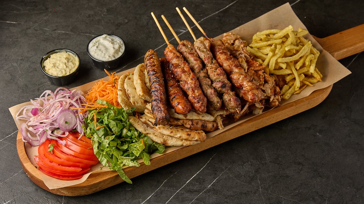 Καλαμάκια χοιρινά, καλαμάκια κοτόπουλο, κεμπάπ, λουκάνικα, ποικιλία γύρων, πίτες, πατάτες