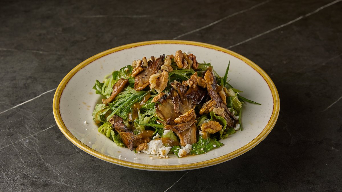 Πράσινη σαλάτα με mix ξηρών καρπών, μανούρι σχάρας, κρουτόν χαρουπιού και vinaigrette πορτοκάλι