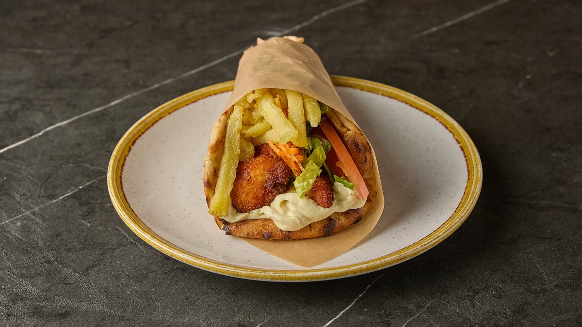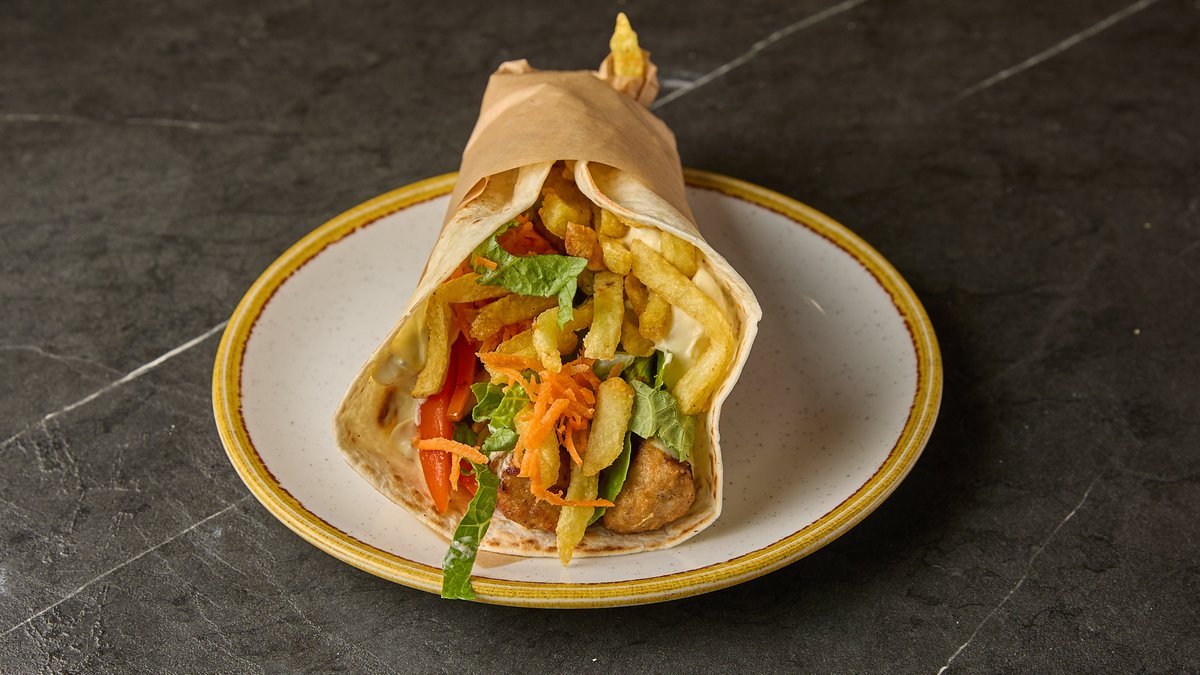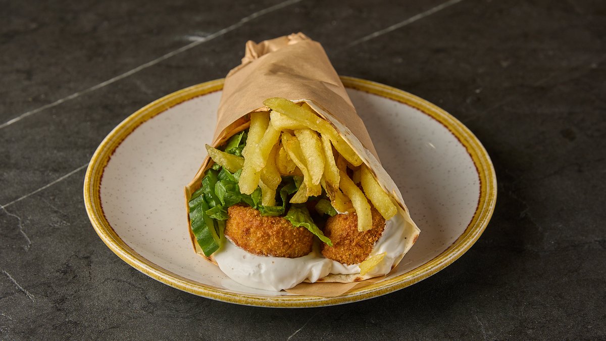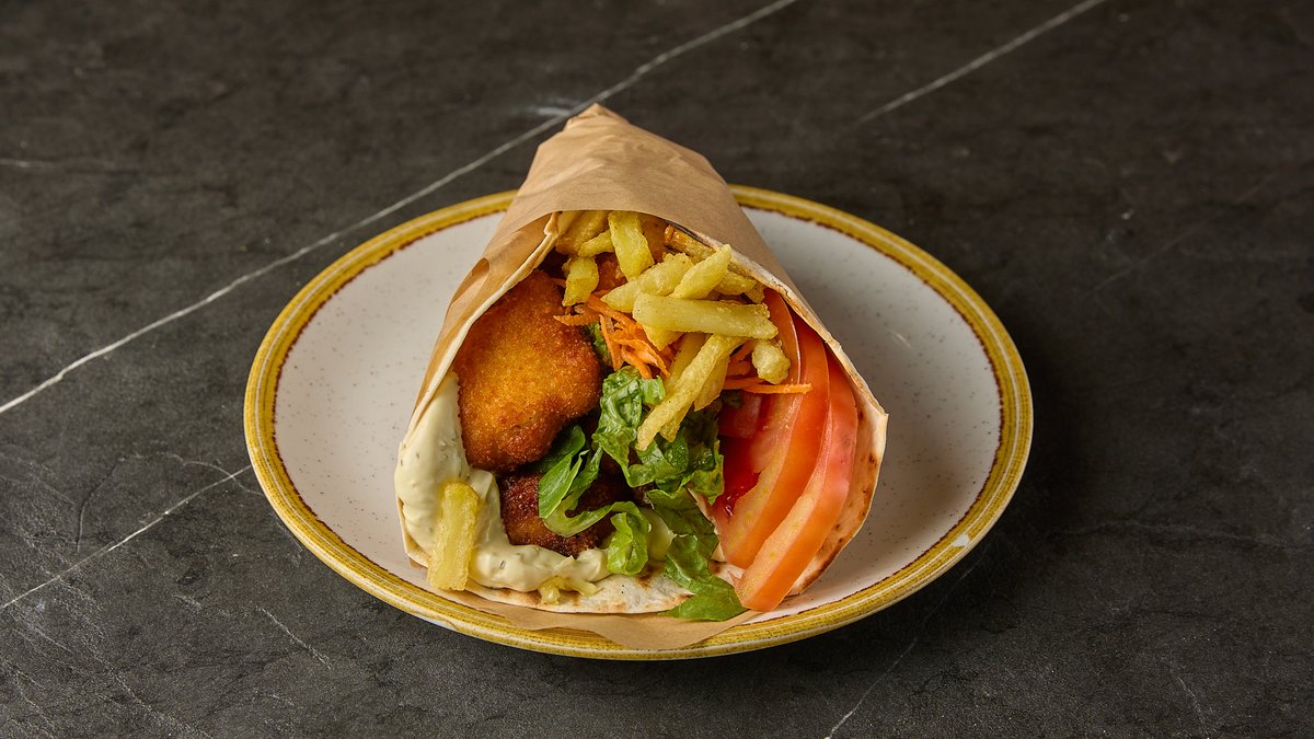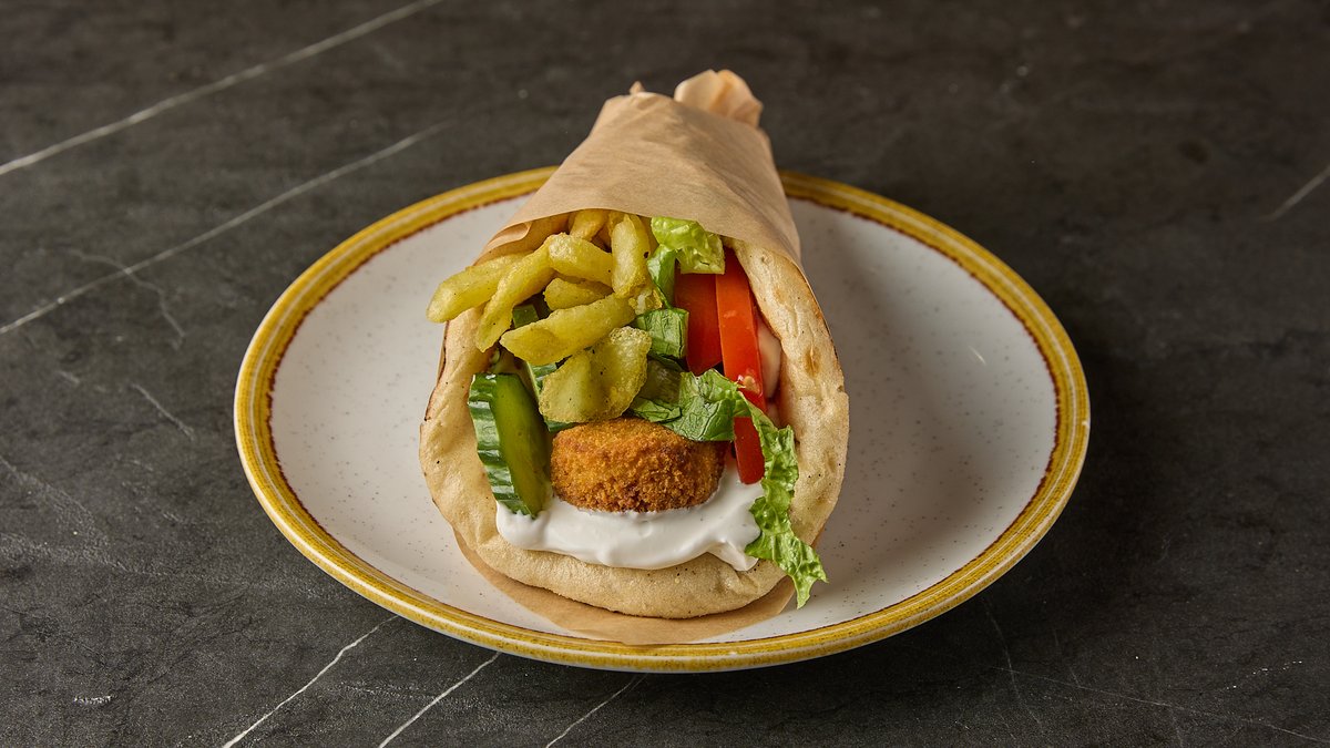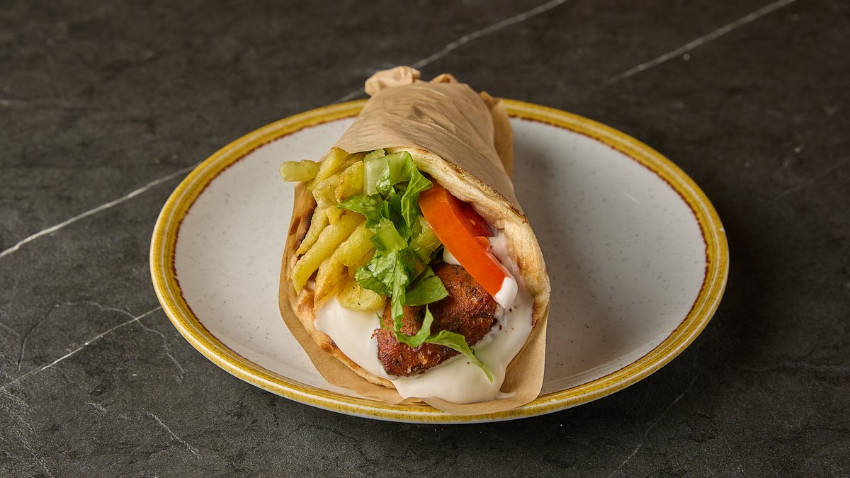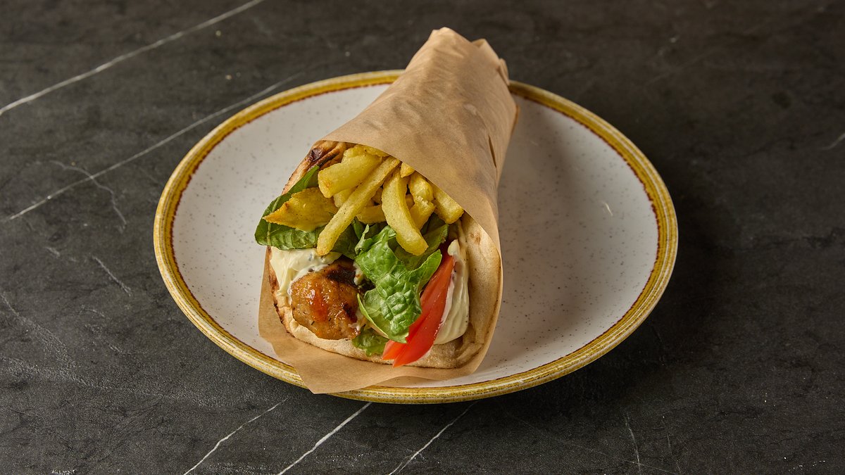 3 Τεμάχια. Συνοδεύεται από πιτάκι, ντομάτα, μαρούλι, πατάτες, vegan sauce