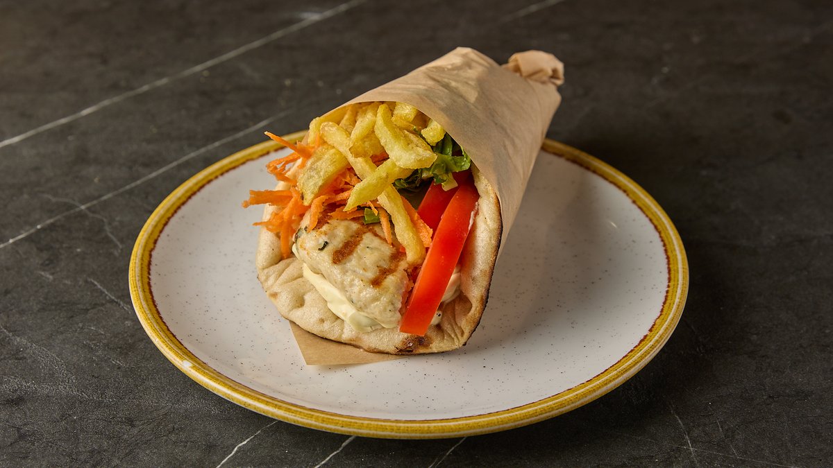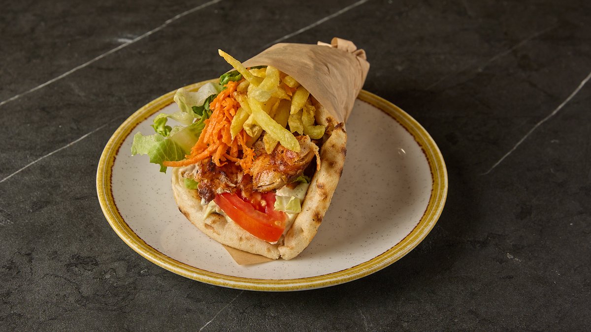 Γύρος κοτόπουλο, πίτα, ντομάτα, μαρούλι, πατάτες, sauce Mythos Plus