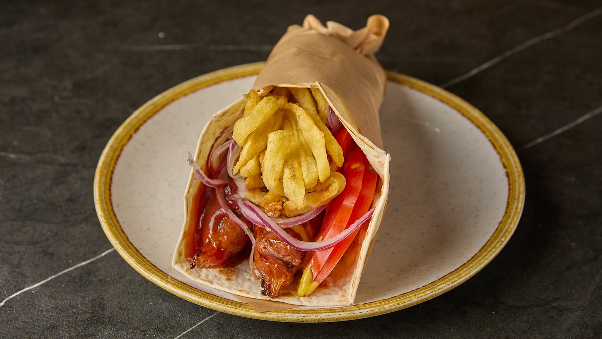 Δύο πίτες γεμιστές με γύρο χοιρινό και κοτόπουλο, ντομάτα, κρεμμύδι, πικάντικη sauce