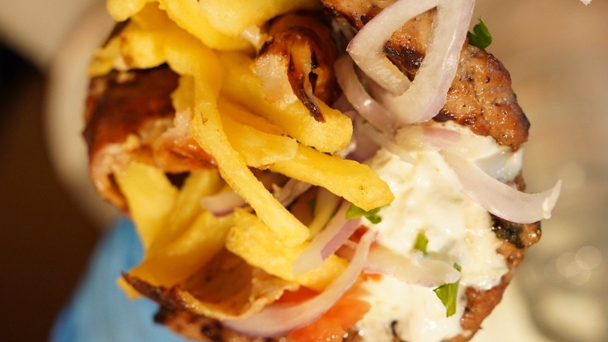 Συνοδεύεται από πίτα, ντομάτα, κρεμμύδι, τζατζίκι και πατάτες τηγανητές