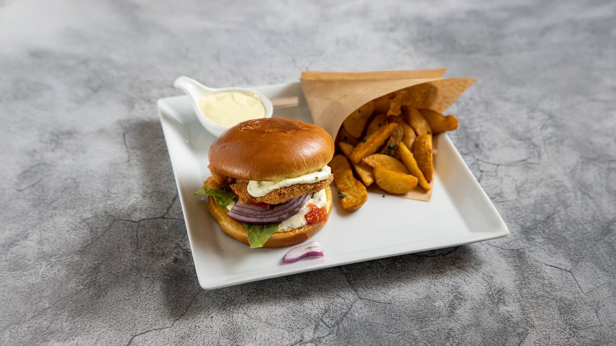 με παναρισμένο φιλέτο μπακαλιάρου,iceberg,ντομάτα,κρεμμύδι & μαγιονέζα