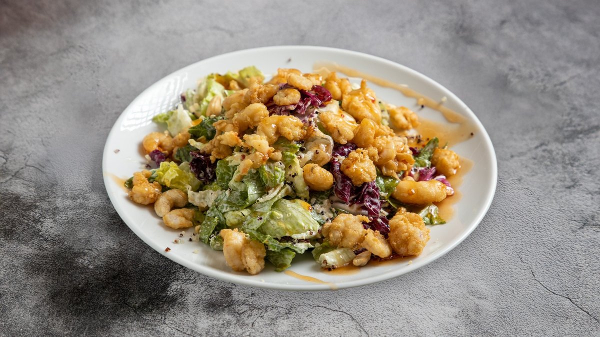 Σαλάτα με μαρούλι, iceberg, κάσιους, κινόα, γαριδάκι με γλυκόξινη σάλτσα και σως Nemo με μαγιονέζα